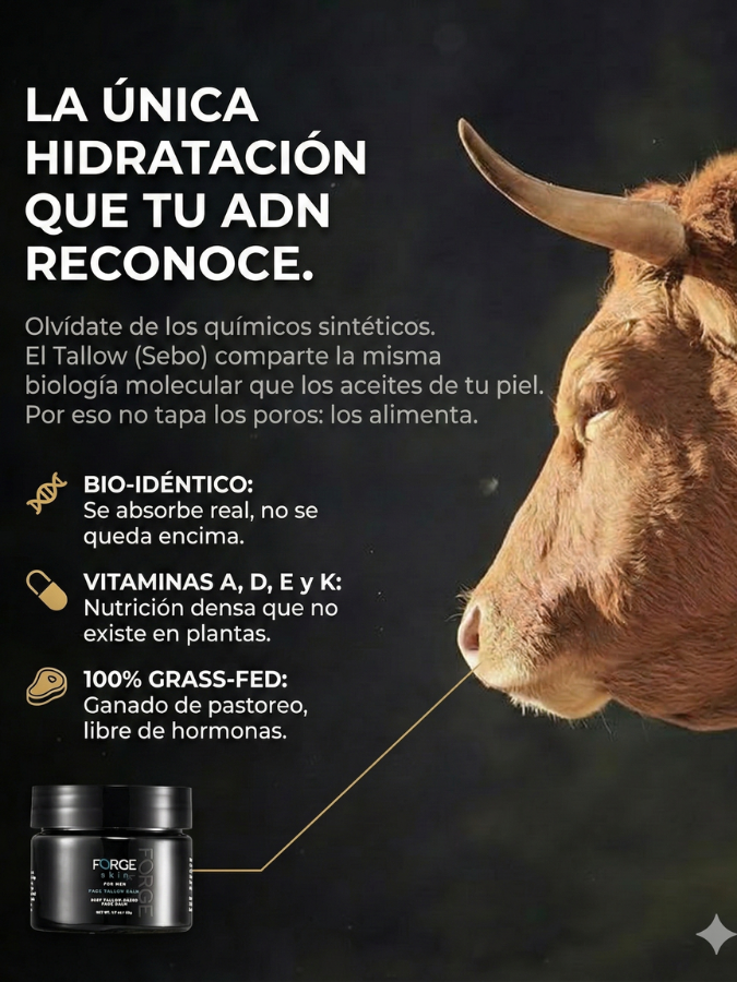 El Tallow (Sebo de res) es grasa bovina 100% Grass-Fed (de pastoreo). Es mejor porque su estructura molecular es casi bio-idéntica a la del sebo humano. Tu piel lo reconoce como nutrición y no como un químico extraño.